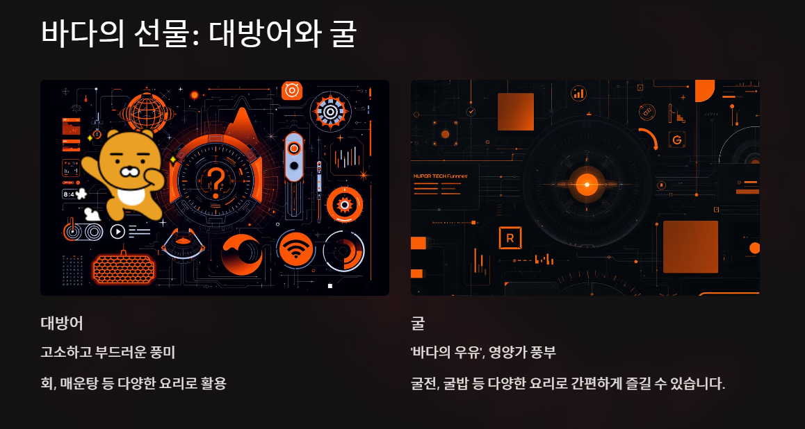 ๋Œ€๋ฐฉ์–ด๋Š” ๊ฒจ์šธ์ฒ ์ด ์ œ์ฒ ์ธ ์ƒ์„ ์œผ๋กœ, ์ง€๋ฐฉ์ด ํ’๋ถ€ํ•ด ๊ณ ์†Œํ•˜๋ฉด์„œ๋„ ๋‹ด๋ฐฑํ•œ ๋ง›์ด ํŠน์ง•์ž…๋‹ˆ๋‹ค. ํŠนํžˆ ๊ฒจ์šธ์— ์žกํžŒ ๋Œ€๋ฐฉ์–ด๋Š” ์‚ด์ด ํƒฑํƒฑํ•˜๊ณ  ์ง€๋ฐฉ ํ•จ๋Ÿ‰์ด ๋†’์•„ ์ตœ๊ณ ์˜ ๋ง›์„ ์ž๋ž‘ํ•ฉ๋‹ˆ๋‹ค. ๋Œ€๋ฐฉ์–ดํšŒ๋ฅผ ์–‡๊ฒŒ ์ฐ์–ด ์‹ฑ์‹ฑํ•œ ์ดˆ๊ณ ์ถ”์žฅ์ด๋‚˜ ์™€์‚ฌ๋น„ ๊ฐ„์žฅ์— ์ฐ์–ด ๋จน์œผ๋ฉด ๊ณ ์†Œํ•œ ํ’๋ฏธ๊ฐ€ ์ž…์•ˆ์— ํผ์ง‘๋‹ˆ๋‹ค. ํšŒ๋ฅผ ์ฆ๊ธด ํ›„์—๋Š” ๋‚จ์€ ๋ผˆ์™€ ๋จธ๋ฆฌ๋ฅผ ํ™œ์šฉํ•ด ์–ผํฐํ•œ ๋งค์šดํƒ•์„ ๋“์ด๋ฉด ๊ฒจ์šธ์ฒ  ๋ณ„๋ฏธ๋กœ ์†์ƒ‰์ด ์—†์Šต๋‹ˆ๋‹ค.
