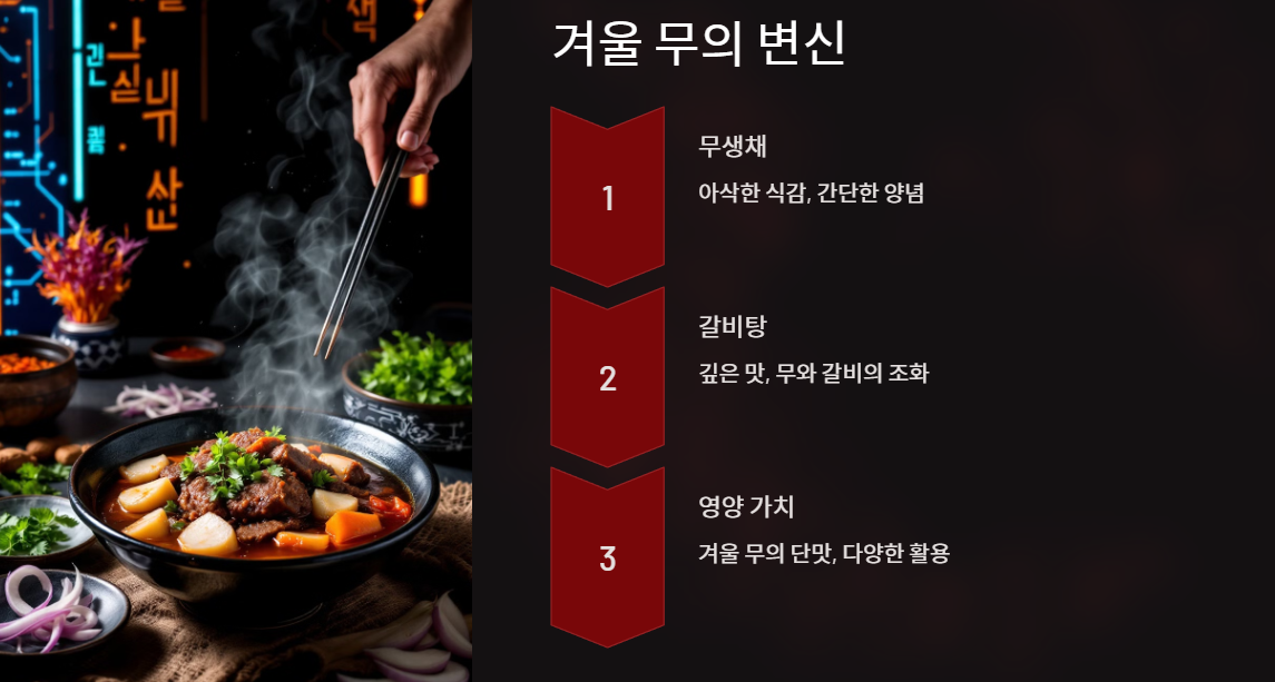 ๊ฒจ์šธ์ฑ„์†Œ ๋ฌด๋ฅผ ํ™œ์šฉํ•œ ๋ฌด์ƒ์ฑ„์™€ ๊ฐˆ๋น„ํƒ•