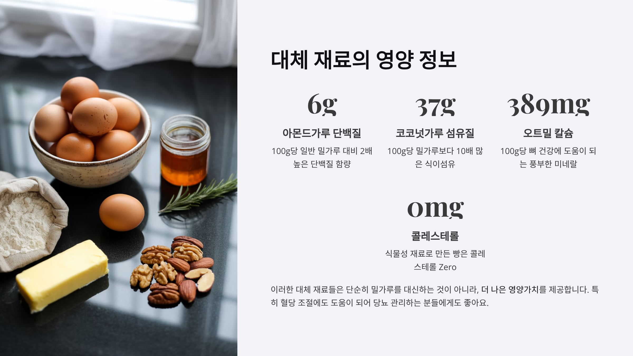 ๊ธฐ์กด ๋ฐ๊ฐ๋ฃจ ๋นต์ ๋น ๋ฅด๊ฒ ํ๋น์ ๋์ด๊ณ , ์ํ ๊ณง ํ๊ธฐ๋ฅผ ๋๋ผ๊ฒ ๋ง๋ค์ด์. ๋ฐ๋ฉด, ๋์ฒด ์ฌ๋ฃ๋ ์์ด์ฌ์ ์ ๋จ๋ฐฑ์ง์ด ํ๋ถํด์ ์๋์ง ์๋ชจ๋ ์ข๊ณ , ํญ์์ ๋ง์์ฃผ๋ ํจ๊ณผ๊ฐ ์์ด์.