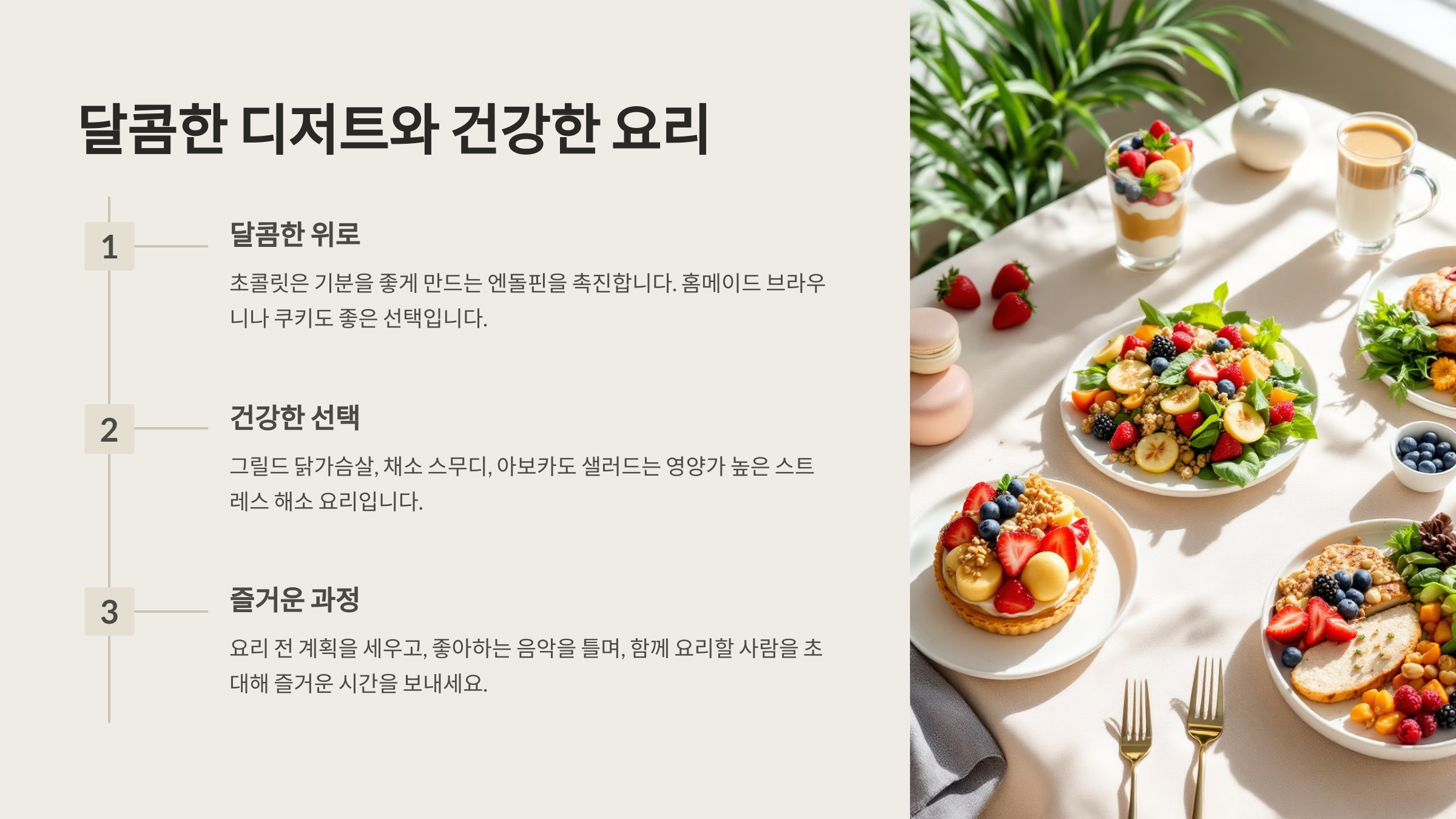 μ€νΈλ μ€λ₯Ό ν΄μνκΈ° μν΄ μ리νλ€λ©΄, μ’μνλ μ¬λ£λ‘ λ©λ΄λ₯Ό μ νλ κ²λ ν λ°©λ²μ λλ€.