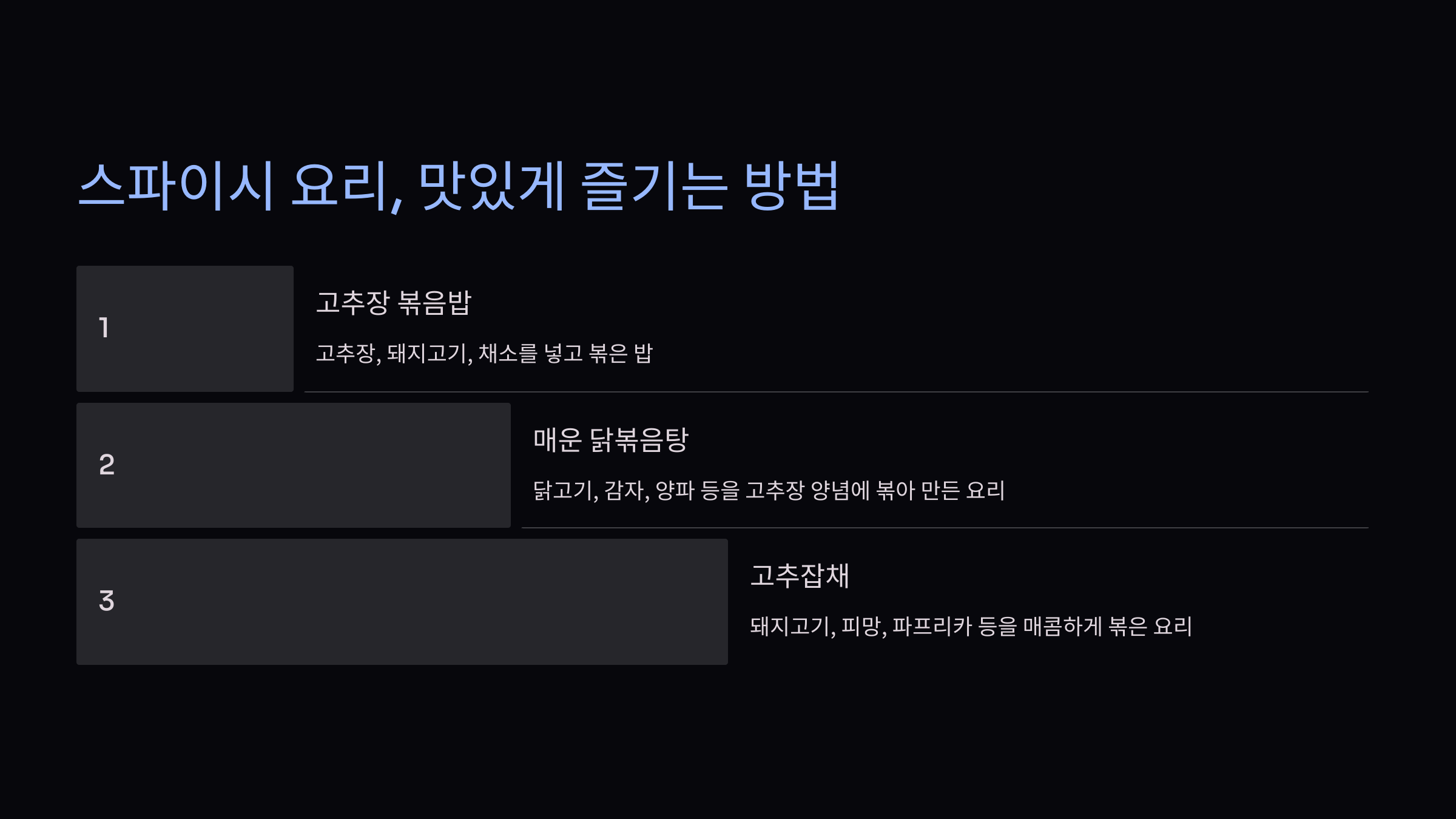 ๋ ๋ฒ์งธ๋ ๋ง๋ผํ์ด์์. ๋ง๋ผํ์ ๋ง๋ผ ์์ค, ์ก์, ๊ฐ์ข ์ฌ๋ฃ(๊ณ ๊ธฐ, ์ฑ์, ์ด๋ฌต ๋ฑ)๋ฅผ ๋ฃ๊ณ ๋์ฌ์ ์ฆ๊ธธ ์ ์๋ ๊ฐ๋จํ ์๋ฆฌ์์. ์ง์ ๋ง๋ผ ์์ค๋ฅผ ์กฐํฉํ๊ฑฐ๋, ์ํ ๋ง๋ผ ์์ค๋ฅผ ํ์ฉํ๋ฉด ๊ธ๋ฐฉ ๋ง๋ค ์ ์์ด์.
