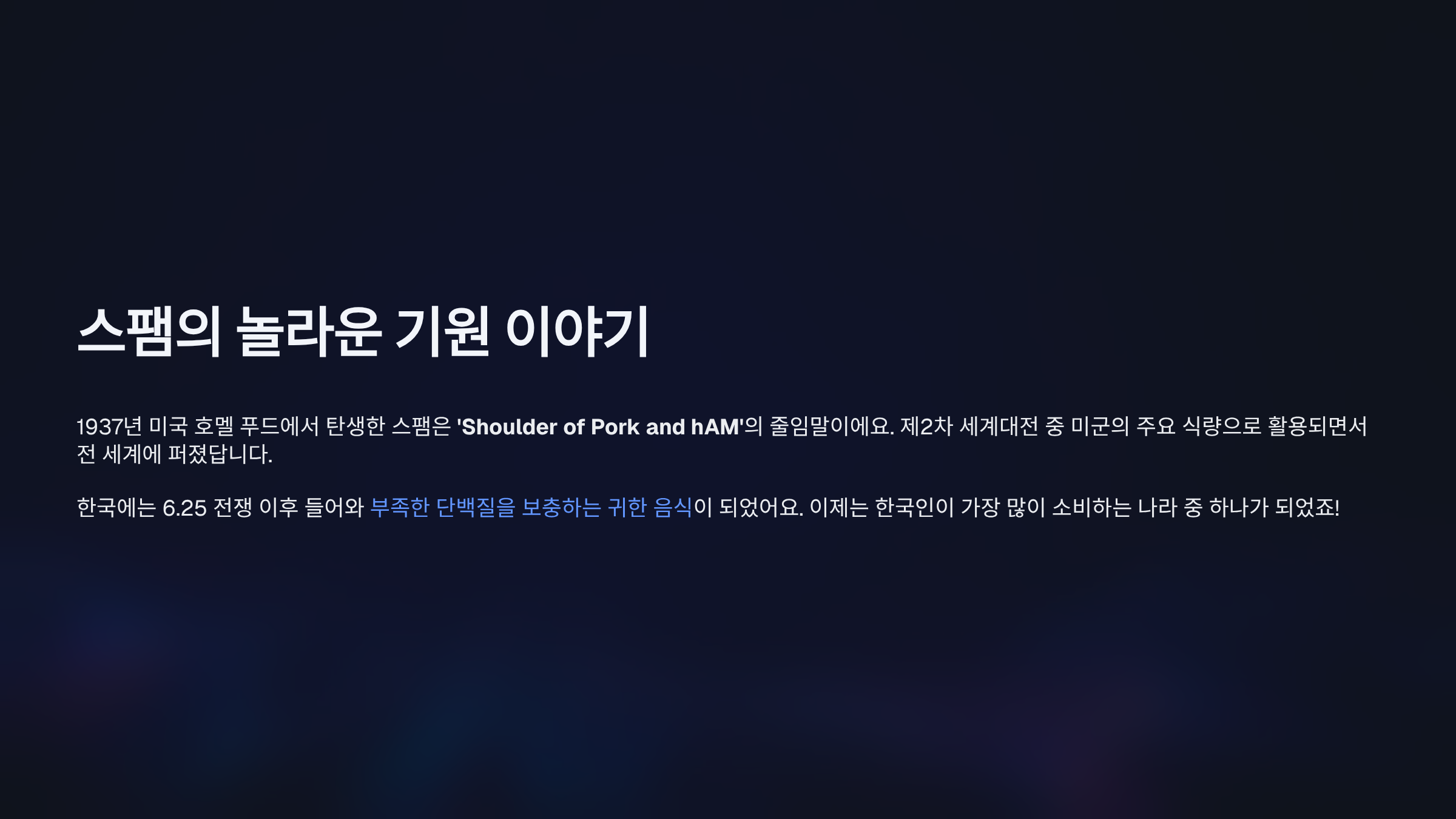 ์คํธ์ ๋ฏธ๊ตญ์์ ์์๋ ํต์กฐ๋ฆผ ํ ์ ํ์ผ๋ก, 1937๋ ํธ๋ฉ(Hormel)์ฌ์ ์ํด ์ฒ์ ์ถ์๋์ด์. ๋น์ ๋ฏธ๊ตญ์ ๋๊ณตํฉ ์ดํ ๊ฒฝ๊ธฐ ํ๋ณต ๋จ๊ณ์๊ณ , ์ฅ๊ธฐ ๋ณด๊ด์ด ๊ฐ๋ฅํ ๋จ๋ฐฑ์ง ์ํ์ด ํ์ํ์ฃ . ์คํธ์ ์ด๋ฐ ์๋์ ๋ฐฐ๊ฒฝ ์์์ ํ์ํ๊ฒ ๋ ๊ฑฐ์์.
