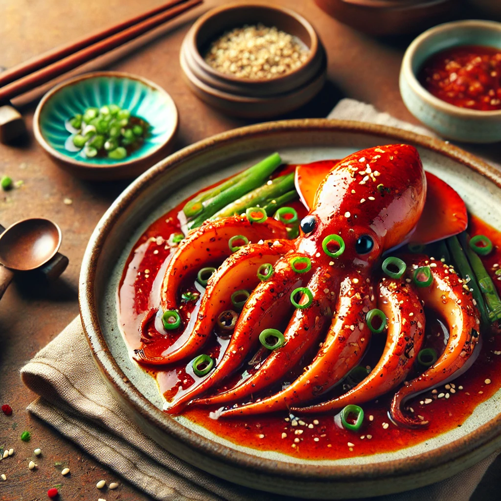 1. ์žฌ๋ฃŒ ์ค€๋น„: ์˜ค์ง•์–ด, ์–‘ํŒŒ, ๋Œ€ํŒŒ, ๋‹น๊ทผ, ์ฒญ์–‘๊ณ ์ถ”, ๊ณ ์ถง๊ฐ€๋ฃจ, ๊ฐ„์žฅ, ์„คํƒ•, ๋‹ค์ง„ ๋งˆ๋Š˜, ์ฐธ๊ธฐ๋ฆ„