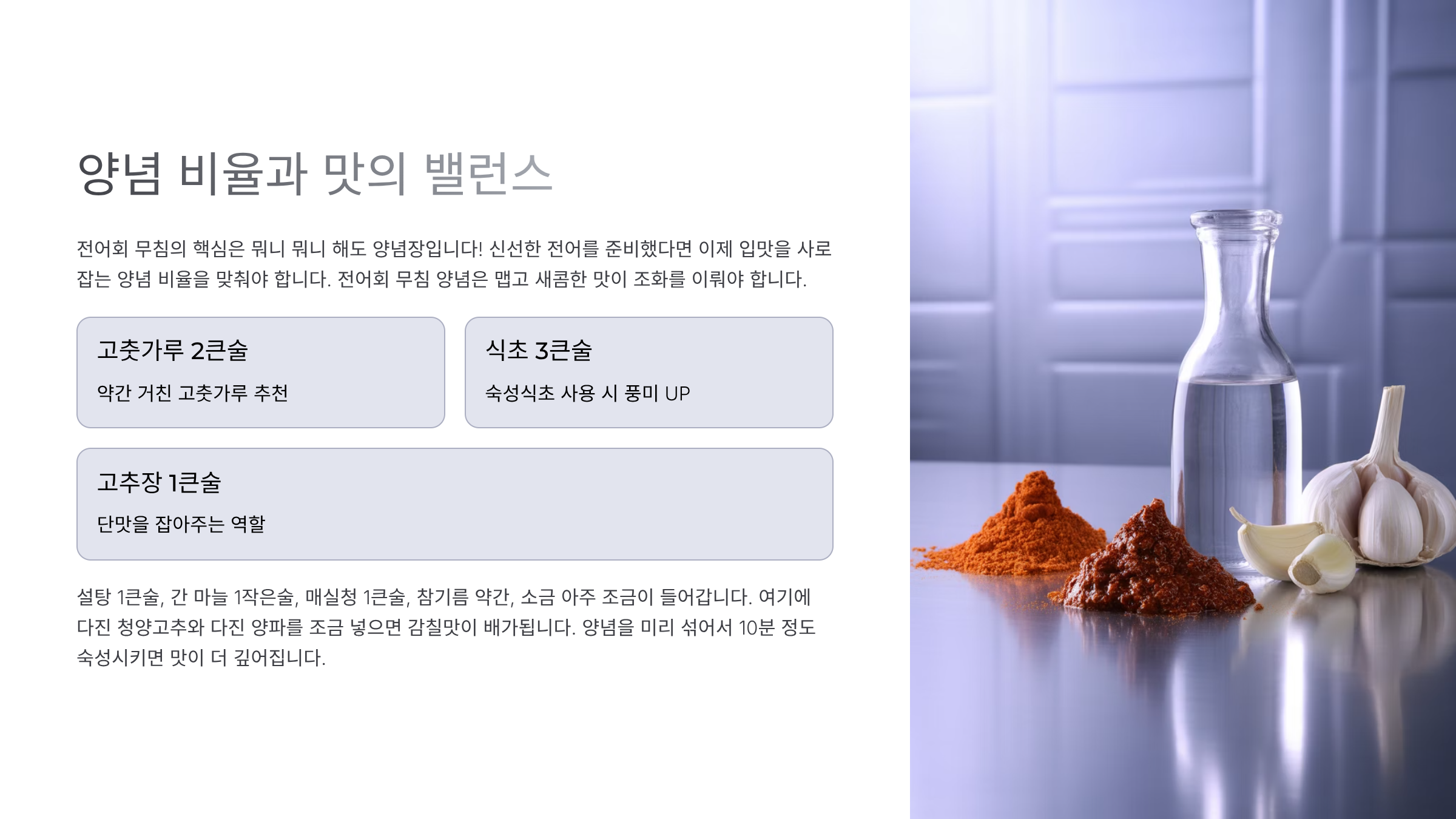 ๊ทธ๋ฆฌ๊ณ ‘๊นป์’, ‘์์ถ’, ‘๋ฐฐ์ถ ์’ ๊ฐ์ ์ ์ฑ์๋ ์ข๊ณ , ๊ณ ์ถ์ ๋ง๋๋ ํจ๊ป ์ธ ๋จน์ผ๋ฉด ๋ง์ด ๋ ํ์ฑํด์ ธ์. ์ ์ ๊ฐ๋ ๊ฐ์์ด ํผ์ง๋ ๋๋์ด๋๊น์? ๐