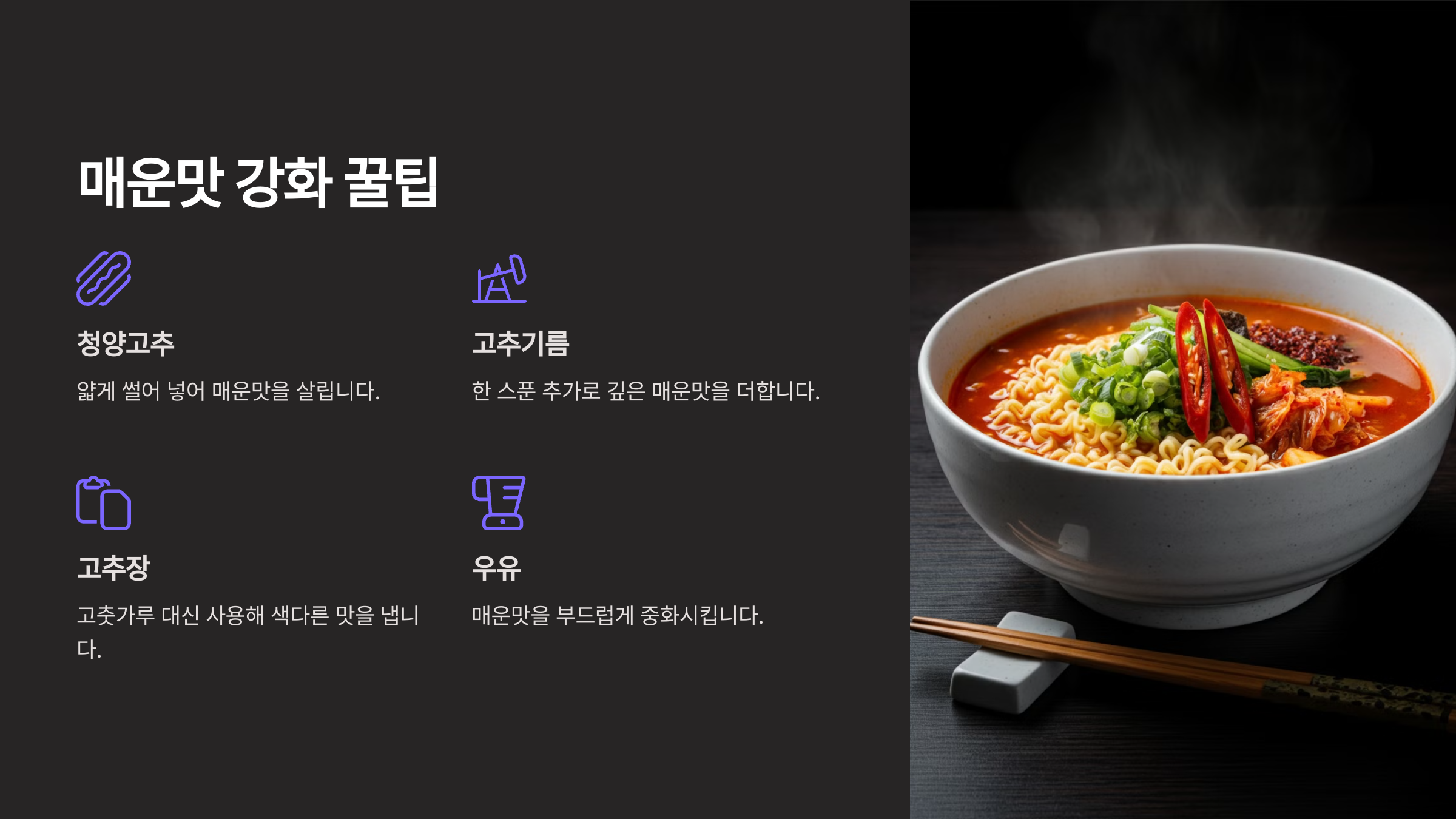 ๋งค์šด๋ง›์„ ์ข‹์•„ํ•˜๋Š” ์‚ฌ๋žŒ๋“ค์„ ์œ„ํ•ด ๋ผ๋ฉด์— ํŠน๋ณ„ํ•œ ์กฐ๋ฏธ๋ฃŒ๋ฅผ ์ถ”๊ฐ€ํ•ด๋ณด์„ธ์š”.