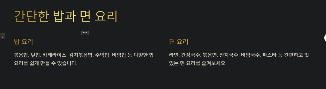 ๋ณถ์๋ฐฅ, ๊ตญ, ์ฐ๊ฐ, ๋ฐํ๋ ์ฉ ๊ณ ๊ธฐ ์๋ฆฌ ๋ฑ์ ๋๋ ํ ๋ฐ์ ๋จน๊ธฐ ์ข์ ์๋ฆฌ์ ๋๋ค.