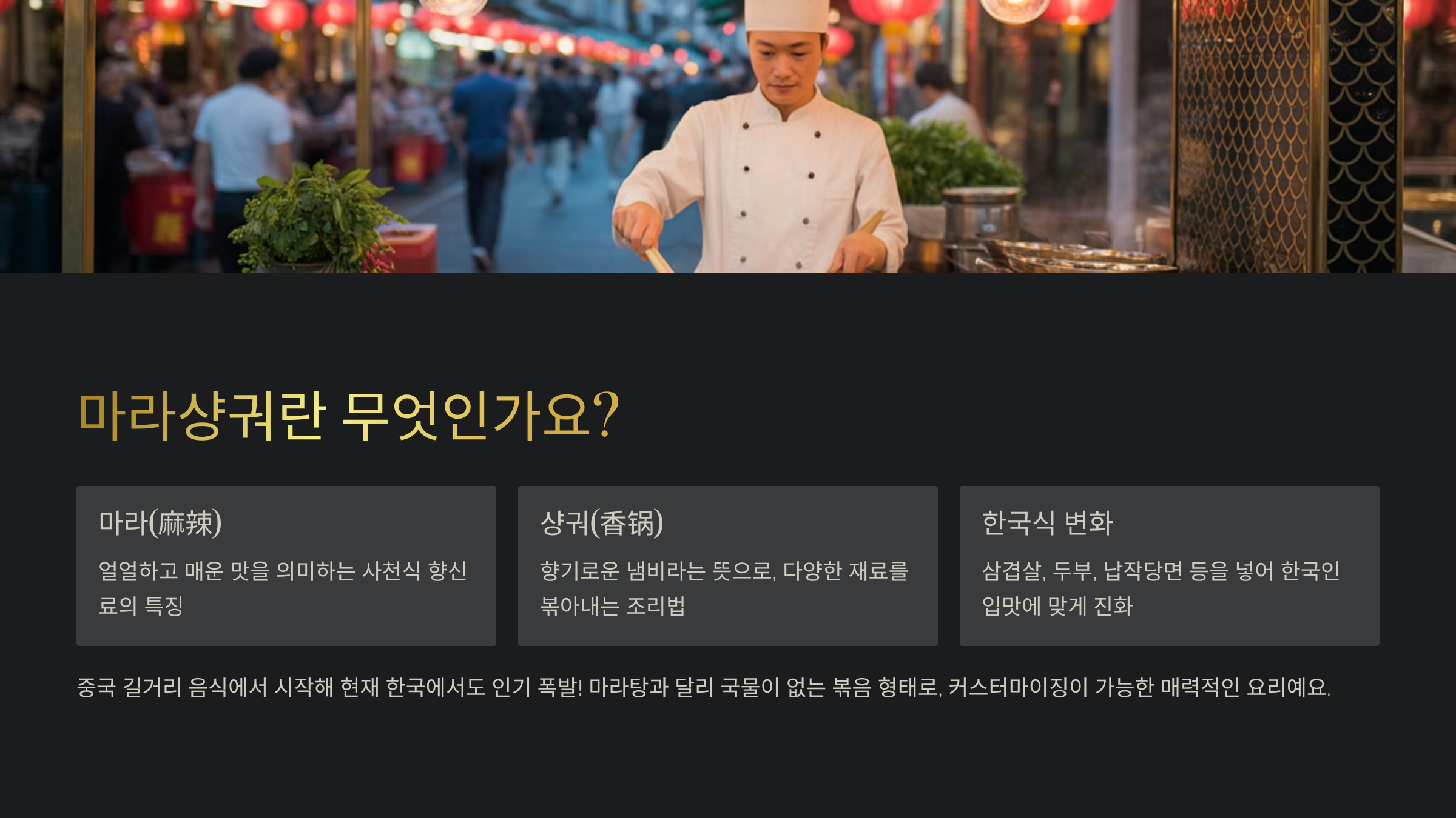๋ง๋ผ์น๊ถ๋ ์ค๊ตญ ์ฐ์ดจ(์ฌ์ฒ) ์ง์ญ์์ ์ ๋ํ ๋งค์ด ๋ณถ์ ์๋ฆฌ์์. "๋ง๋ผ(้บป่พฃ)"๋ '์ผ์ผํ๊ณ ๋งค์ด ๋ง', "์น๊ถ(้ฆ้ )"๋ 'ํฅ๊ธฐ๋ก์ด ๋๋น'๋ผ๋ ๋ป์ด ์์ด์. ์ง์ญํ๋ฉด '๋งค์ด ํฅ๊ธฐ๋ก์ด ๋๋น ๋ณถ์'์ด๋ผ๊ณ ํ ์ ์์ด์. ์ฌ๋ฃ๋ฅผ ๋ค์ํ๊ฒ ๋ฃ๊ณ ๋ง๋ผ์์ค๋ฅผ ๋ฃ์ด ๋ณถ์ ๋จน๋ ๊ฒ ํน์ง์ด์์.